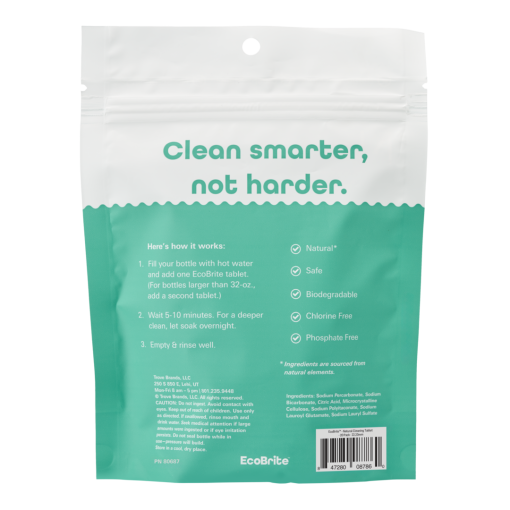 - Fill your bottle with hot water and add one EcoBrite tablet